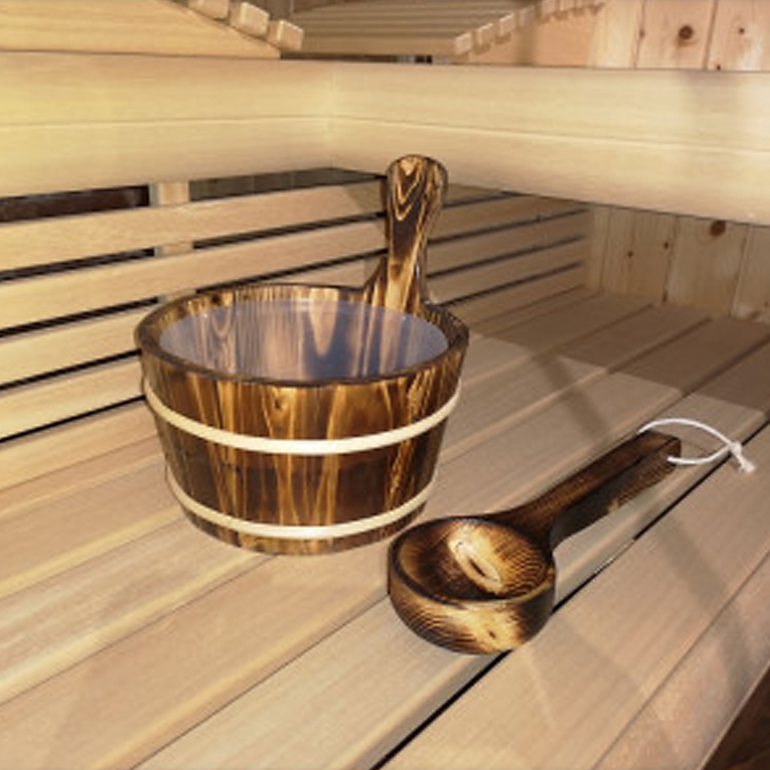 Dazu gehört eine Schöpfkelle aus Holz um Wasser auf die Saunasteine zu spritzen und traditionellen finnischen Saunadampf zu erzeugen.